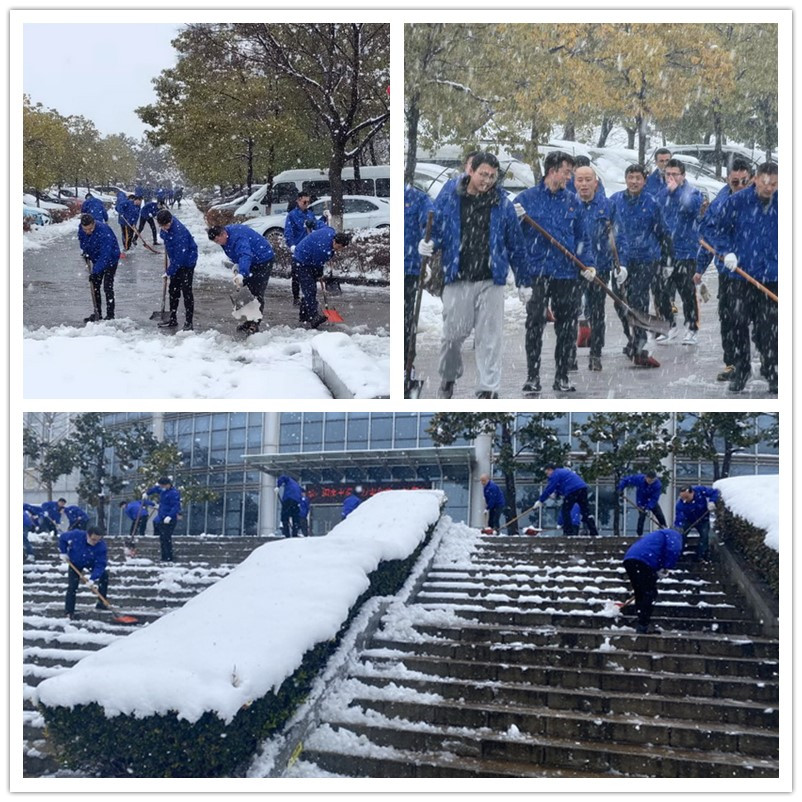 在尹總、趙總監(jiān)、鄧主席的帶領(lǐng)下,參與掃雪的同志們,不畏嚴(yán)寒,頂著風(fēng)雪,積極投身到掃雪“戰(zhàn)斗”中,大家揮舞著鐵鍬、雪鏟和掃帚對(duì)公司交通主干道、大門口、坡道、臺(tái)階、停車場(chǎng)等處的積雪進(jìn)行清掃。大家齊心協(xié)力,配合默契,有的鏟,有的推,有的掃,快速將積雪鏟起集中堆放,把廠區(qū)內(nèi)道路和臺(tái)階上的積雪逐漸清理干凈。盡管同志們的手和臉被凍的通紅,衣服、褲子、鞋子也被雨雪浸濕,然而這一切絲毫沒有影響大家的熱情和清掃效率,手中的掃雪工具不停地?fù)]舞。