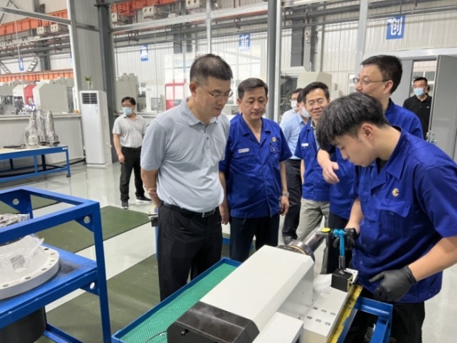 陶海龍總經理一行首先參觀了公司裝配部、高端事業部,尹仁華董事長向客人們介紹了南二機床歷史沿革、公司運營現狀、未來發展愿景以及主要產品核心部件的生產裝配等情況。陶海龍總經理仔細考察了南二機床磨齒機、珩齒機、車齒機等高端齒輪機床生產裝配流程,并不時詢問一些技術和生產關鍵性問題,尹仁華等領導逐一進行解答。